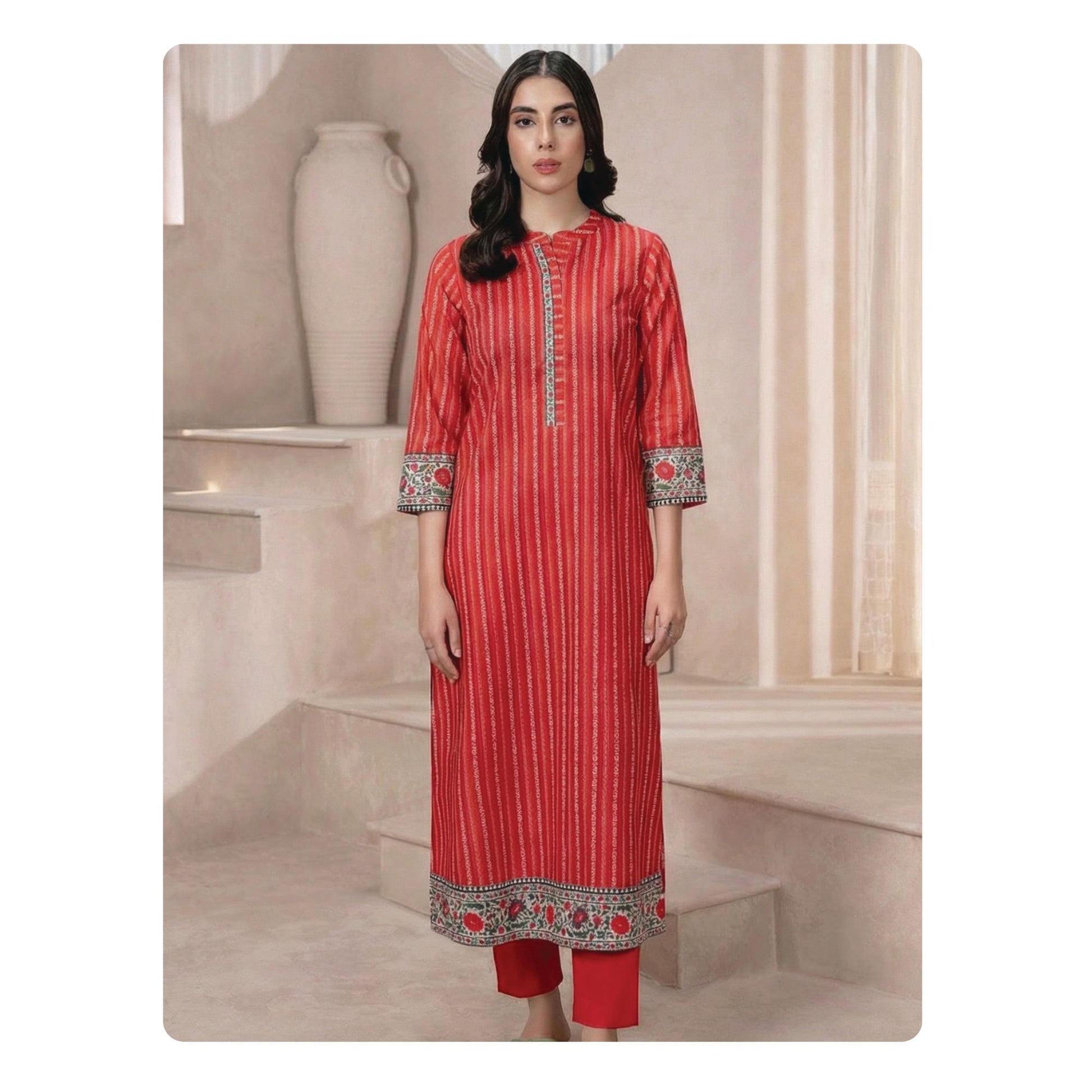 The printed lawn shirt and matching printed dupatta create a cohesive look, while the dyed lawn trouser adds simplicity and balance. Unstitched for customization, this suit adapts effortlessly to your personal style.